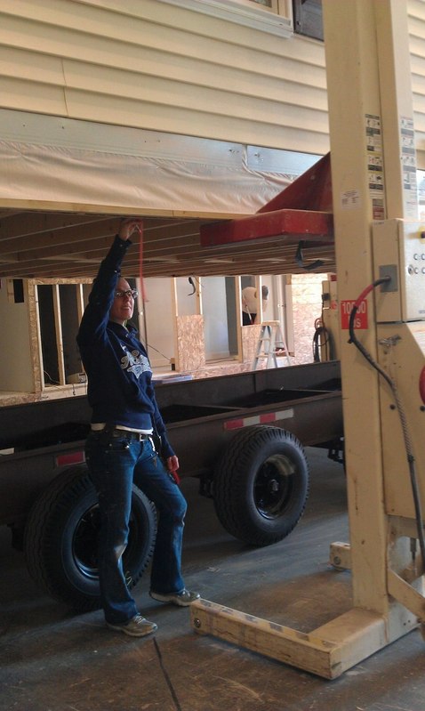 Before the finished home goes on the transportation carrier, we inspect the home one more time. We use special lifts to raise the home high enough to do a final review of the plumbing, ductwork, and floor construction.